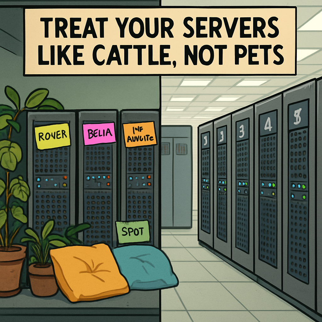 There's an old DevOps saying: 'Treat your servers like cattle, not pets.' Pets have names. You care for them individually. When they get sick, you nurse them back to health. Cattle are numbered. They're interchangeable. When one has problems, you replace it.